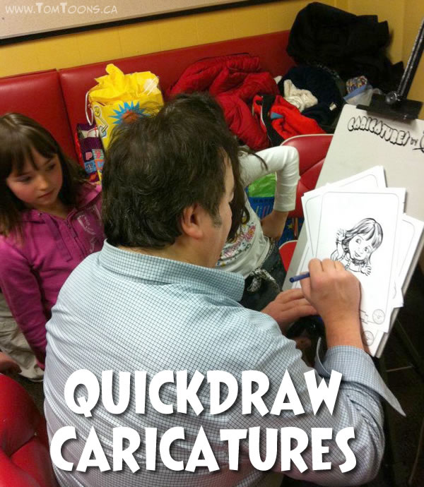 "QuickDraw Caricatures" are done live and in-person at special events. Corporate sponsors can choose to have their logo and event name & date pre-printed onto a custom border design. This serves to reinforce their brand awareness on the attendee's special souvenir. People will always be reminded of where and when they got drawn as well as who had sponsored their "free caricature". Caricatures are treasured for years. |